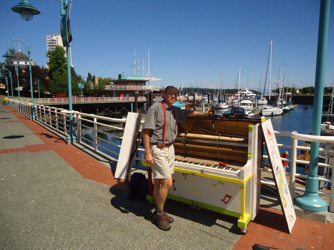 As a piano technician, I have volunteerd my time to ensure that the Nanaimo pianos remain playable during their outdoor stint this summer.  Keep in mind – these are old pianos, and this in not the best situation to put a piano in to keep it working well!  The over 2000 different parts of a piano prefer stable temperature and stable humidity, something that doesn’t happen on the waterfront of Vancouver Island.  However, it has been fun to hear the sounds of piano music wafting across the harbour this summer as anyone who wants to play can go give it a try!